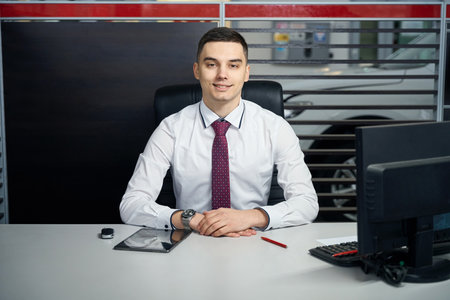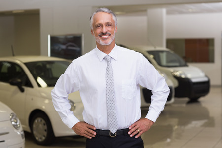 Portrait of confident smiling consultant in car salon. Car dealer in showroom