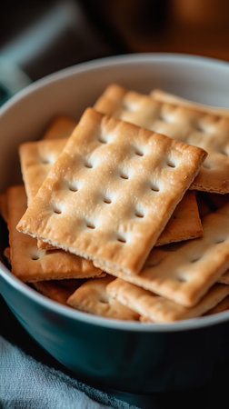 Crispy Golden Brown Crackers in Teal Bowl Delicious Snack Food Photography eat meal tasty baked