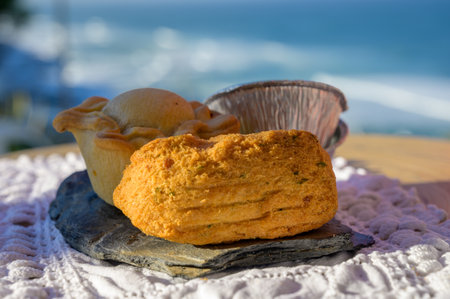 Portuguese food, oven baked chicken pie empada de frango and codfish croquette pastais de bacalhau, served outdoor with view on blue sunny Atlantic ocean near Sintra in Lisbon area, Portugal