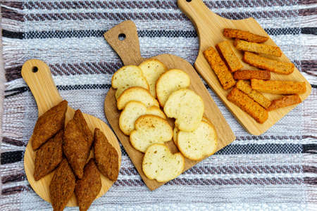 fried croutons close-up three types of crackers white, black, brown. topview. flat lay
