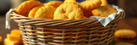 Freshly baked golden cookies in a rustic wicker basket on a wooden table