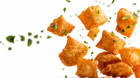 Delight in the tempting look of these crunchy fried snack bites tossed in the air, showcasing a burst of flavor with herbs and spices, perfect for various occasions.