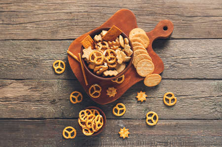 Bowl with tasty different crackers on wooden background