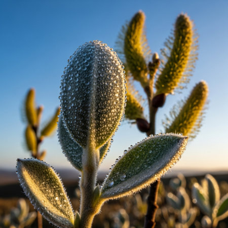 A high-definition, centered macro view capturing the intricate texture of Pussy Willow catkins (Sali