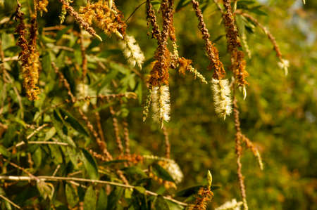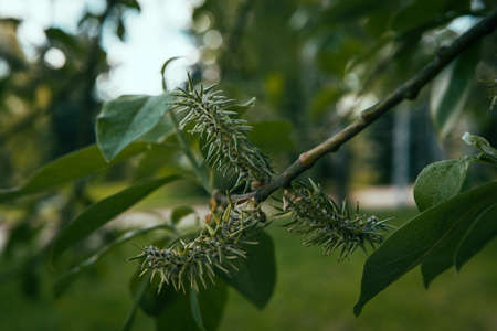 Close-up of young flowers of weeping willow with delicate leaves on narrow branches against a green background in spring