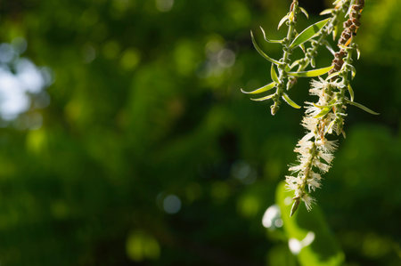 White flower pollen that raises a beautiful bouquet of Melaleuca quinquenervia flower. Blurred background of green leaves and branches under bright sky.