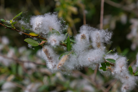 Salix atrocinerea. Close-up of a jack salce branch with the mature female catkins, seeds, and leaves.