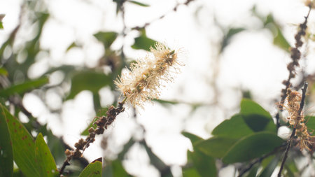 Melaleuca cajuputi flower, in shallow focus, commonly known as cajuput. Cajuput oil is a volatile oil obtained by distillation from the leaves of cajuput trees