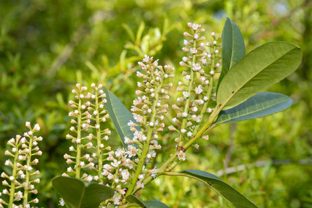 Close up of English laurel (prunus laurocerasus) flowers in bloom