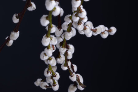 Several pussy willow twig on a black background with copy space or empty text place. Easter greeting card. Religious spring layout. postcard. natural mockup design. springtime. Wartime.