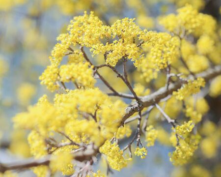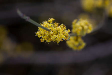 branches with flowers of European Cornel Cornus mas in early spring. Cornelian cherry, European cornel or Cornelian cherry dogwood Cornus mas flovering. early spring flowers