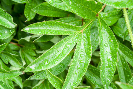 Fresh green spring summer background with drops. Peony leaves covered with drops of water