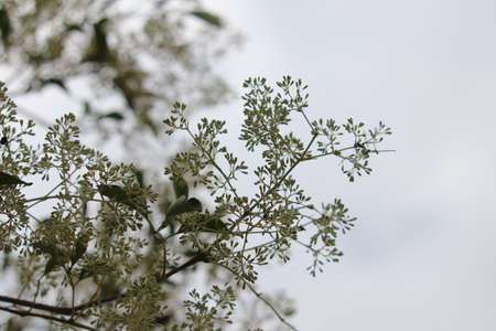 Group of white Sweet Osmanthus or Sweet olive flowers blossom on its tree in spring time