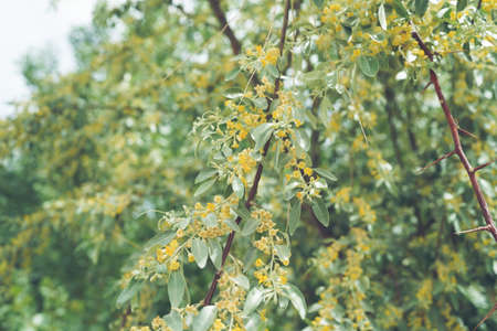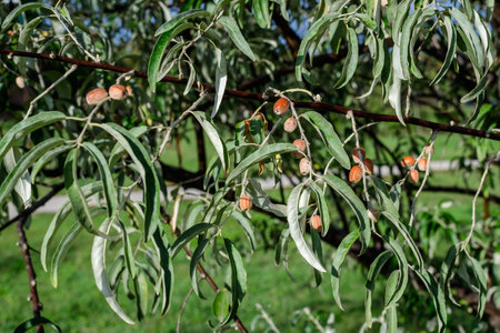 Silver leaves and small ripe fruits or berries of Elaeagnus angustifolia plant, commonly called wild Russian or Persian olive, silver berry, oleaster, on branches in a sunny autumn day
