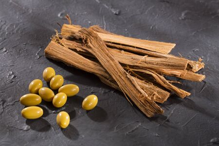Ayurvedic Mulethi or Liquorice root stick or jeshthamadh powder served in a bowl over moody background
