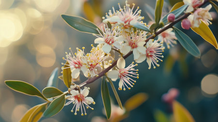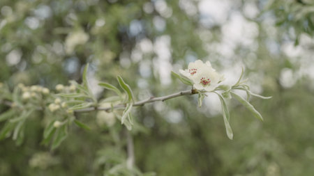 Delicate white and pink flowers bloom on a sunny branch during spring, showcasing natures beauty in a tranquil garden setting