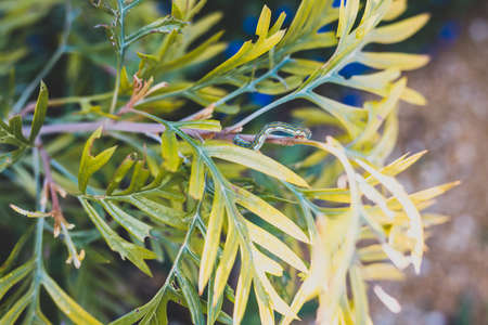 native Australian grevillea plant with colorful caterpillar on it in beautiful tropical backyard shot at shallow depth of field