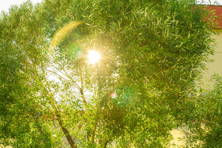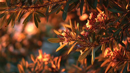 The Oleander at sunset, Golden red sunset light filters through the leaves, still atmosphere, warm orange glow blending with natural green tones.