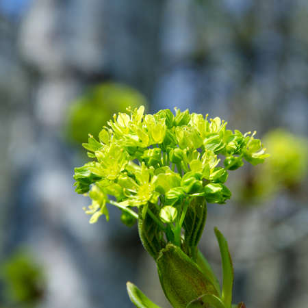Flower of euphorbia palustris blooming in spring. Copy space. Selective focus.
