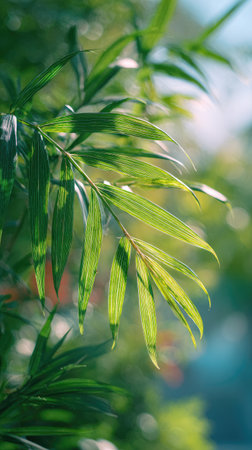 A sunlit portrait of a single Bamboo palm, photographed outdoors on a clear, breezy day. Fresh, crisp air renders vivid detail in the leave veins glowing with gentle backlight. The background falls into a soft natural bokeh of greenery, colors truetolife, organic beauty in pure sunlight.