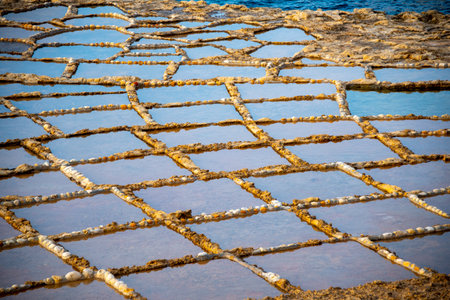 Salt evaporation ponds, also called salterns or salt pans located near Qbajjar on the maltese Island of Gozo.