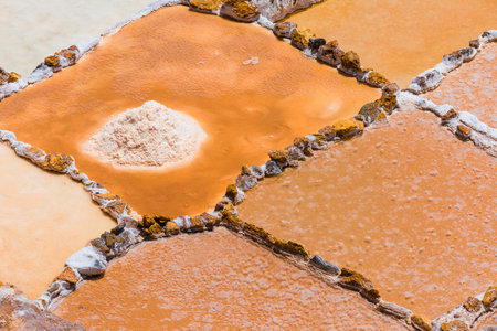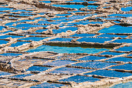 Terraced salt pans also known as Salineras de Maras, among the most scenic travel destination in Cusco Region, Peru. Telephoto view from above of the colorful ponds' reflecting surfaces.