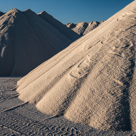 Detailed perspective captures an industrial salt mining site, showing large piles of processed salt, and orange conveyor systems under a clear blue sky, creating a unique textural image.