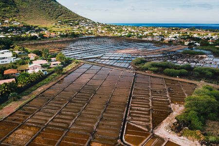 Ocean salt recovery fields in France. Marais salants. Drone view.