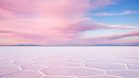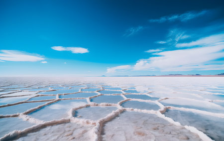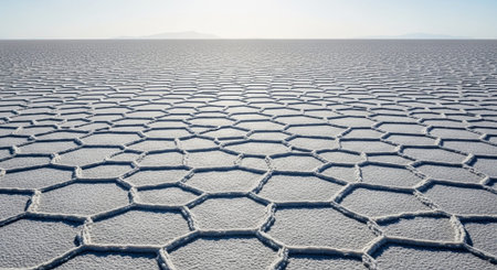 Hexagonal salt flat mosaic with stark white crystals surreal and otherworldly
