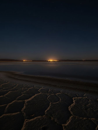 A stark landscape at night featuring cracked earth in the foreground, leading to a calm body of water reflecting subtle lights on the horizon. The deep blue night sky is dotted with faint stars,...