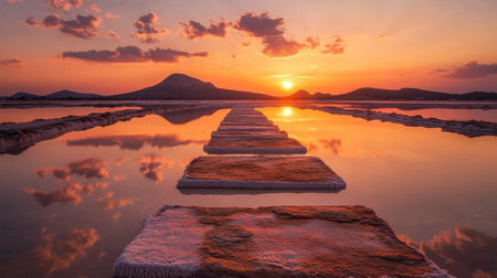Salt farm in the morning with sunrise sky. Organic sea salt. Evaporation and crystallization of sea water. Raw material of salt industrial. Sodium Chloride. Solar evaporation system. Iodine salt.