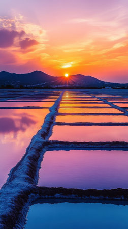 A vertical shot of natural salt evaporation ponds at scenic sunset