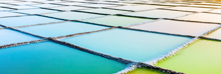 Generative AI, Salt farm landscape, photorealistic top view drone, horizontal banner. Extraction of salt from sea water