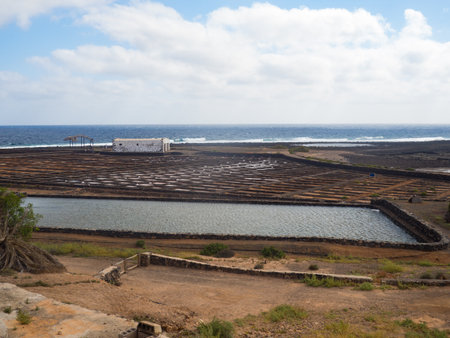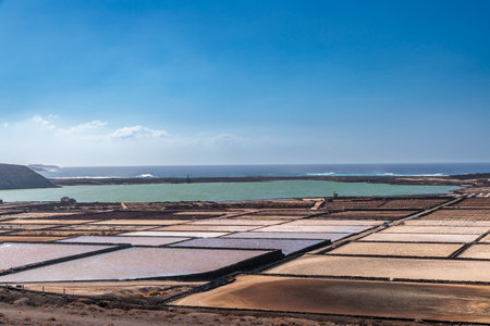 Photogenic industry: salt pans on the coast of the Atlantic ocean. Traditional way to extract the salt from the sea water. Blue sky with some clouds. Salinas de Janubio, Lanzarote, Canary Islands, Spain.