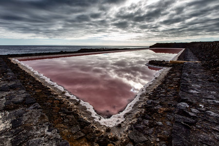 Volcanic pool on the salt manufaturing with pink salt water and sky reflection on the sunset on La Palma island