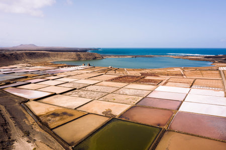 View of Salinas de Janubio, salt flats in Lanzarote, Canary Islands. Sea salt water is pumped to surface and evaporated to yield salt