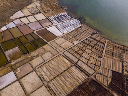 Aerial view of saline pond and salt evaporation ponds filled from ocean salt crystals. Salt production. Lanzarote Island, Spain.