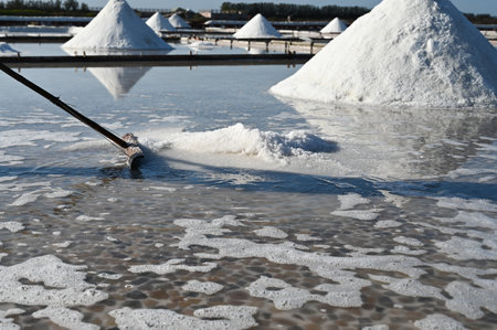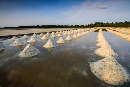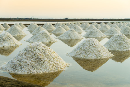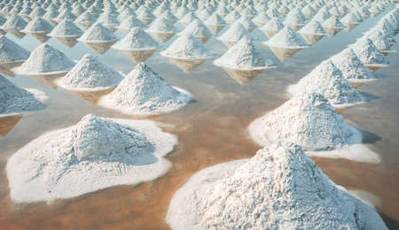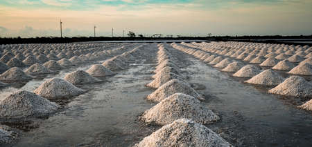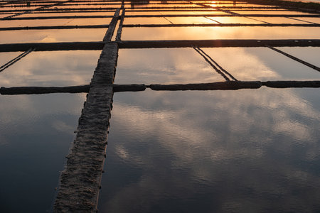 Salt farm in the morning with sunrise sky. Organic sea salt. Evaporation and crystallization of sea water. Raw material of salt industrial. Sodium Chloride. Solar evaporation system. Iodine salt.