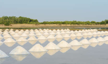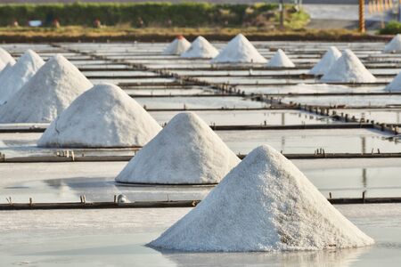 Close up of salt piles in salt farm made from sea water in Thailand.