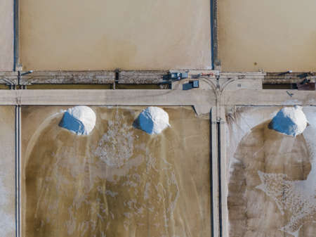 Aerial top view of farmers making heaps of raw sea salt piles with sea. Farm field outdoor. Nature material in traditional salt industry in Thailand. Asia culture. Agriculture lifestyle people.