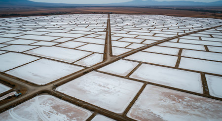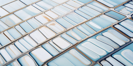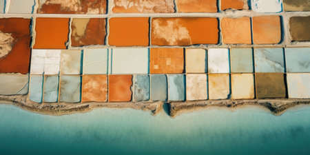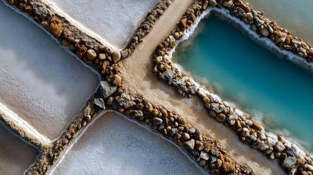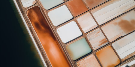 Generative AI, Salt farm landscape, photorealistic top view drone, horizontal banner. Extraction of salt from sea water