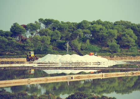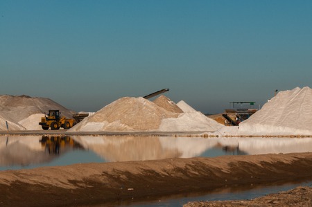 Sea salt production. Salt evaporation pond with tractor and conveyor.