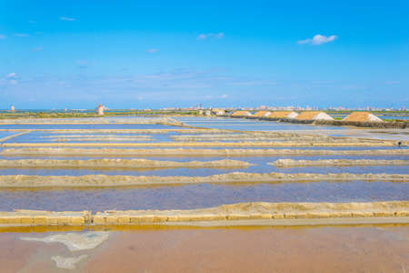 Salt field with shanty in panorama view, with blue ocean color background. Feeling of being immense and lonely.