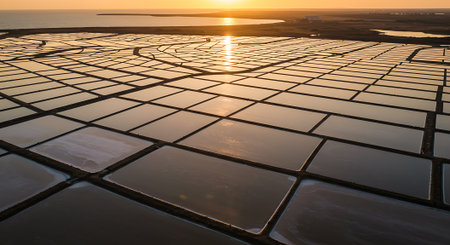 Ocean salt recovery fields in France. Marais salants. Drone view.