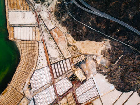 Abstract aerial view of salt ponds in salt production. Lanzarote, Spain.