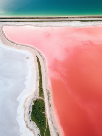 Aerial top view of beautiful salt lake with pink water. View of pink lake from flying drone. Drone copter photography from above. Landscape with drone