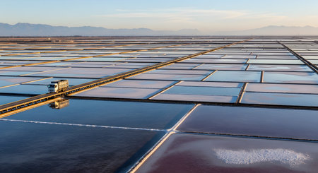 An expansive aerial view shows a salt farm with geometric evaporation ponds reflecting the sky at sunrise. A truck drives along a narrow road bisecting the colorful salterns, illustrating the process of industrial salt production and harvesting.