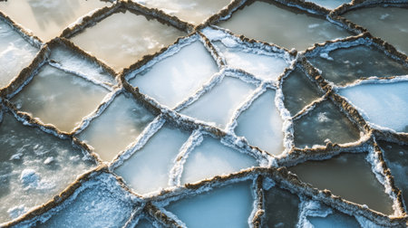 Close-up of salt crystals forming intricate patterns on the surface of a pond in a salt farm, captured under natural light.