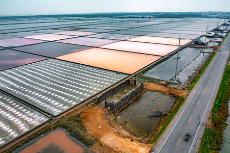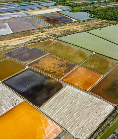 Aerial drone photo of colourful salt flats textures in Phetchaburi, Thailand