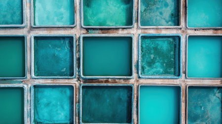A captivating aerial image showcasing a grid of water basins in various shades of blue and green, ideal for creative projects and artistic inspiration.